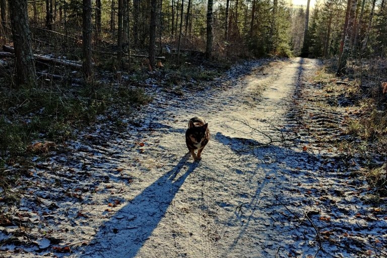 Kun adoptoimme innokkaan lenkkeilijän, länsigöötanmaanpystykorvan Rolfin, vakiopitkä ulkoilukierros oli tietysti harjuseiska. Väylää käyttivät monet muutkin koiranulkoiluttajat, joten vapaana juoksemisen hurmaa Rolle pääsi nauttimaan harjun huipulla pitkällä suoralla, jolla näki sekä eteen että taakse. Hyvin Rolf jaksoi pienillä jaloillaan tikuttaa kilometrin toisensa jälkeen. Kesäkuumalla lähdimme vasta illansuussa, silloin juomapullot molemmille mukana.