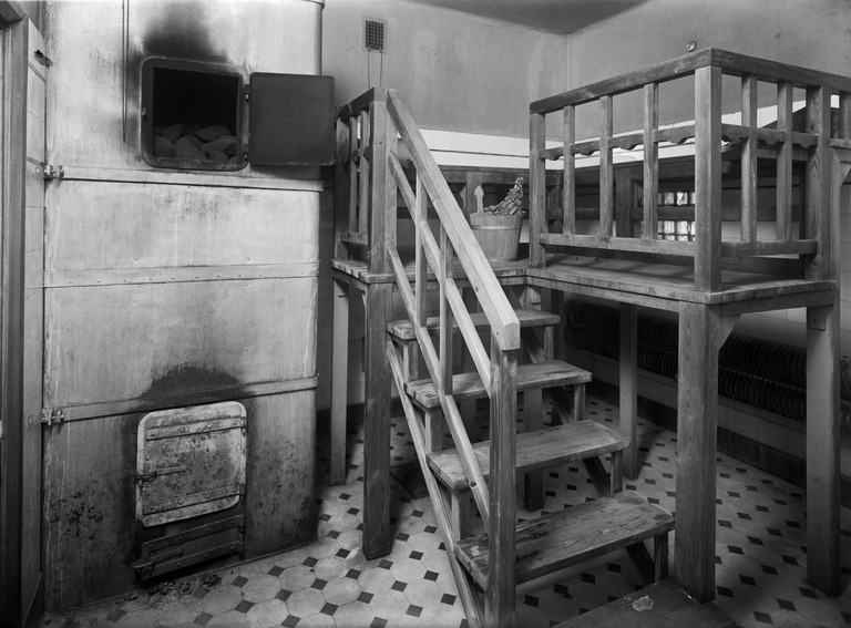 Lauantaikin on työpäivä, yleensä lyhyt, jo iltapäivästä päättyvä, puolittainen vapaapäivä. Sauna on korttelin suuren talon kellarikerroksessa lähes kokonaan maan alla. Parin kadunvälin matka taittuu säässä kuin säässä jalan. Valoa siivilöytyy tiloihin pienistä, matalista ikkunoista. Maksu suoritetaan oven viereiselle kassatiskille, josta saamme vaatekaapin avaimen. Arvoesineet on silti syytä jättää kotiin: kovin hataralta näyttää kaapin ovi. Löylyhuone on pimeä, pelottava ja polttavan kuuma. Nurkassa hehkuu valtava mustunut kiukaanmöykky, joka sivaltaa ilkeästi sihisten terävällä poltteella ihoon. Ja aina on paikalla joku ylälauteen ”Tapsa”, jonka koura ei löylykauhasta irtoa. Ei, vaikka joku alalauteilla kärvisteleviin pikkupoikiin viitaten pyytää hieman taukoa tolkuttomaan löylynlyömiseen. Uho on kova ja kilpailuhenkeä on naukattu ennen saunaan tuloa talon nurkalla porukan yhteisestä pullosta. Vaihtoehtoina on joko kärsiä hiljaa alimmalta lauteella tai rynnätä nahka punaisena pois löylyistä pukuhuoneeseen huilaamaan ja henkeä vetämään. Sen voin sanoa, ettei tuollaisessa kuumuudessa ja tungoksessa mitään intohimoa saunomiseen syntynyt.