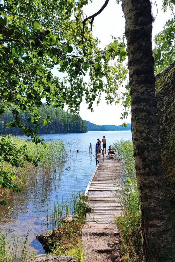 Se Ritvalan ja Timsön puilla lämmitettävän rantasaunan idylli löytyi Vesansalosta, vieläpä tuplana. Jos totta puhutaan, niin toinen, sellainen varttitunnissa lämpiävä pikasauna, on mökin pihassa. Kun kuistilla oikeaan suuntaan päätään kurottaa, voi kuvitella näkevänsä Luopoistensalmen veden välkkeen. Kohti Kinissaarta katsova iso sauna on sitten se aito rantasauna suurine kiukaineen ja muuripatoineen. Ja mikä parasta; pitkän laiturin päästä voin tehdä sen, mikä on olennaista. Voin hypätä pää edellä suoraan Päijänteeseen.