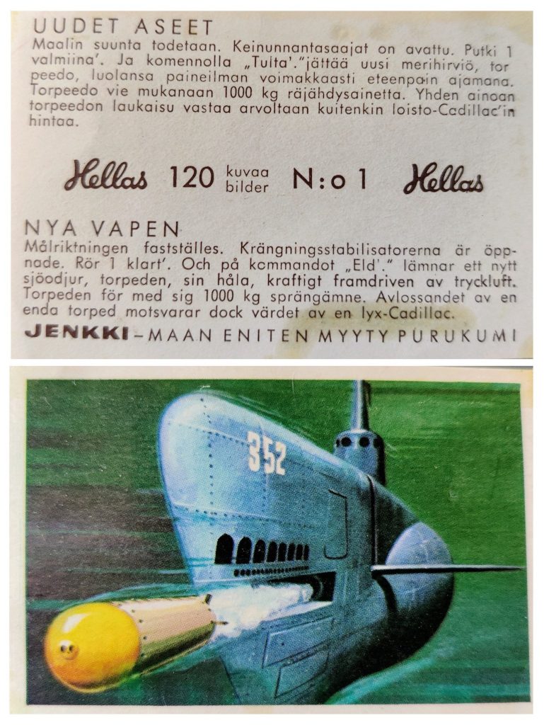 The card doubles are taken to school, although they don’t look favorably on the exchange of cards during the breaks. Some cards seem almost impossible to get. After all, I’m now only missing one, the number 44. My friend Saku tells me that one of the boys in my parallel class, has friend, living in Helsinki, who has it. You have to believe in that information, because Saku can describe the lost treasure in detail. It’s hopeless!