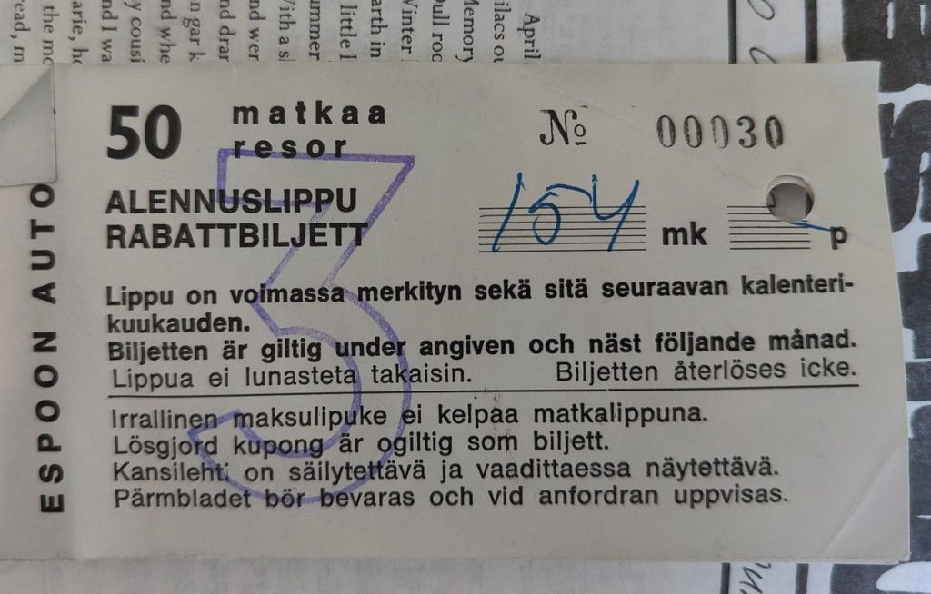 Kerran kovalla pakkastalvella juoksin matkalippu valmiiksi kädessä repäistynä kiireellä bussiin ja ehdinkin kyytiin juuri kun kuski suhautti oven kiinni. 194 ei ollut ehtinyt kuin vasta Runeberginkadun alkuun kun kauhukseni huomasin, että toissapäivänä ostettu lippuvihko ei ollut paikallaan lompakossani. Pengoin hikisenä tavaroitani pari pysäkinväliä. Vihkon oli täytynyt pudota lumeen kun loikkasin bussiin. Painoin nappia ja hyppäsin pois kyydistä. Pakkasesta huolimatta puhkuin yltä päältä hiessä, kun olin vartin päästä takaisin Simonkentällä. Potkiskelin pitkään asemalaitureiden kinoksia etsien vihkosta, tuloksettomasti. Joku onnekas oli saanut lahjaksi puolentoista kuukauden matkat. Maksoin käteisellä synkeän paluuni Tapiolaan. Jäin pois Tapiolantien Ärrällä ja ladoin muutaman setelin tiskiin. Tunkiessani uutta vihkoa lompakkooni tein lupauksen itselleni, etten koskaan irrota lippua vihkosta ennen kuin olen kokonaan bussin sisällä.