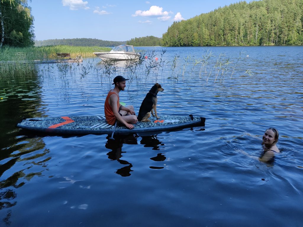 Lapset ja heidän kumppaninsa pääsevät myös kokeilemaan pystymelontaa. Sitähän tuo SUP-lyhenne tarkoittaa. Toisen tyttäreni Didi-koira, joka on innokas uimari, pääsee laudan kyytiin, samoin tyttärentyttäreni. Uusi laituri, ennätyssyvä ja -lämmin vesi innostavat kaikki pulikoimaan ja järvellä oleiluun. Kaksoset oppivat uimaan ilman sen kummempaa ohjausta: kolme tuntia päivässä Päijänteessä on paras opettaja. Heinäkuun puolivälissä molemmissa kämmenissäni on kovettuma eli suppikänsä. Lautakärry saa uudet pyörät. Täyskumiset renkaat kulkevat pehmeästi. Lisäliinalla saan sidottua kaiken tarvittavan kyytiin. Rutiini on viimeistelty loppuun saakka.