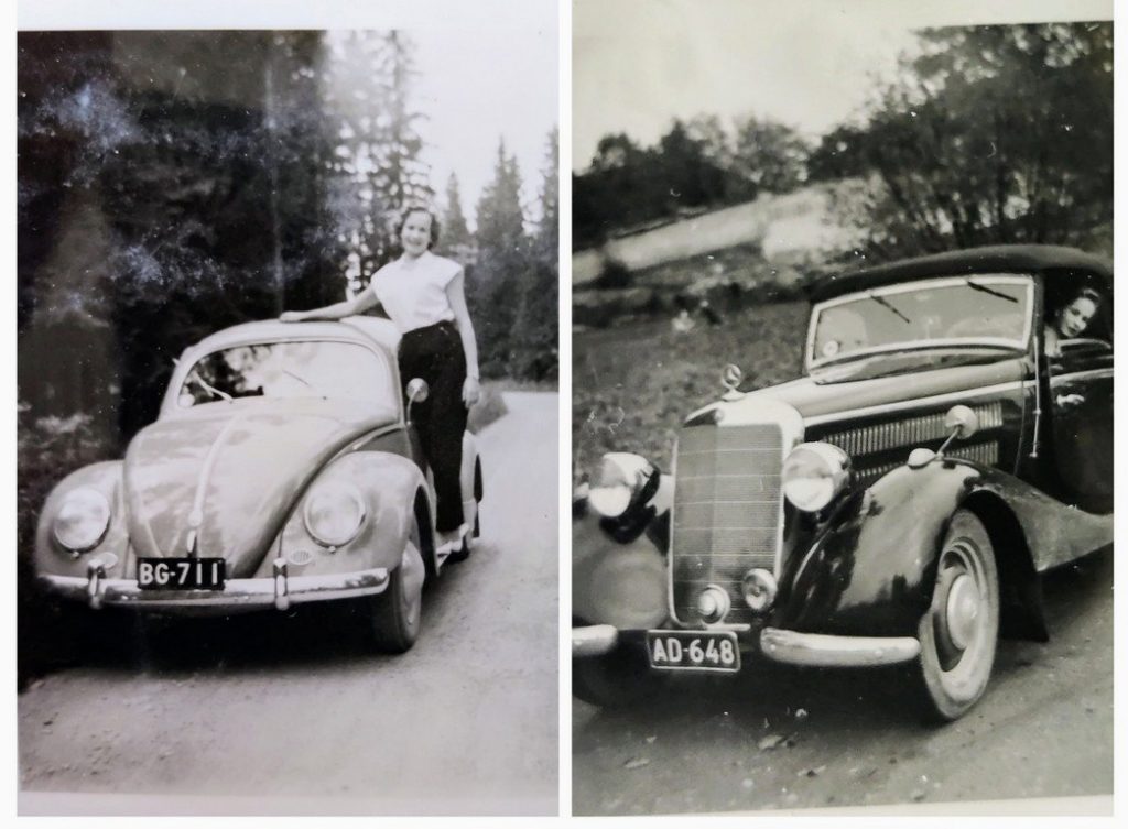 Kylpyammeen petoeläimen tassuilta näyttävät jalat pelottavat minua. Meillä on molemmissa asunnoissa kylpyhuone ja sisävessa. Nuo ovat vielä vuosikymmenen puolivälissä ylellisyyksiä. Myös se, että perheemme auto vuonna 1955 on Mercedes-Benz 220 A Cabriolet, kertonee korkeasta elintasosta. En muista minkälaista kyyti oli rättikatto-Mersussa. Mersu vaihtuu Volkswageniin heti uuden vuoden alussa – aikamoinen tasonpudotus siis. Mutta onhan Kuplavolkkarikin sentään länsisaksalainen auto aikana, jolloin länsiautojen maahantuontia rajoitetaan kovalla kädellä. Muutto isompaan huoneistoon ja lapsen syntymä lienee sanellut autoilun järkiratkaisun perusteet. Hai-luokan purjeveneestä luovutaan vasta Tapiolaan muuton alla 1960 kesällä.