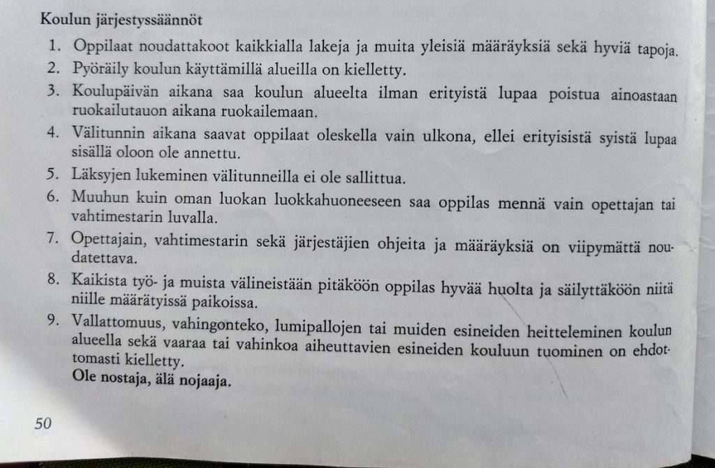 Lastentarhan pihalta näkyy kansakoulu, kansakoulun pihalta näkyy oppikoulu. Eräänlaisen vihreän, nurmikkoisen kolmion sisään ne kaikki mahtuvat. Yhteiskoulu on valtavan iso, moneen suuntaan leviävä laitos. Oppilaita on lähes tuhat. Ensimmäisen päivän jännitys on niin kova, että olen pissata housuihini, vaikka olen minä täällä koulua käynyt; ne muutamat kerrat, kun kävin sunnuntaiaamun pyhäkoulussa. Nyt en pidä kiinni äitini kädestä. Hän on töissä.